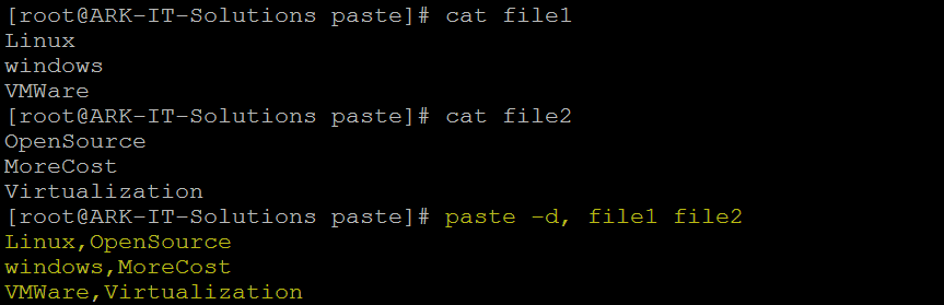 paste –d, -s file1 #Combined the 'file1' and 'file2' with comma (,) separated.